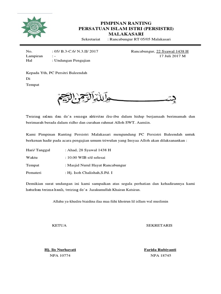 Yuk simak contoh surat undangan pengajian bulanan.docx Ada 7 halaman contoh surat undangan pengajian bulanan ukuran HVS 1.9MB. Contoh surat undangan pengajian pernikahan doc. contoh surat undangan pengajian rutin mingguan sample surat undangan. contoh surat undangan pengajian Simak juga soal tentang pengajian serta belajar materi contoh surat undangan pengajian bulanan